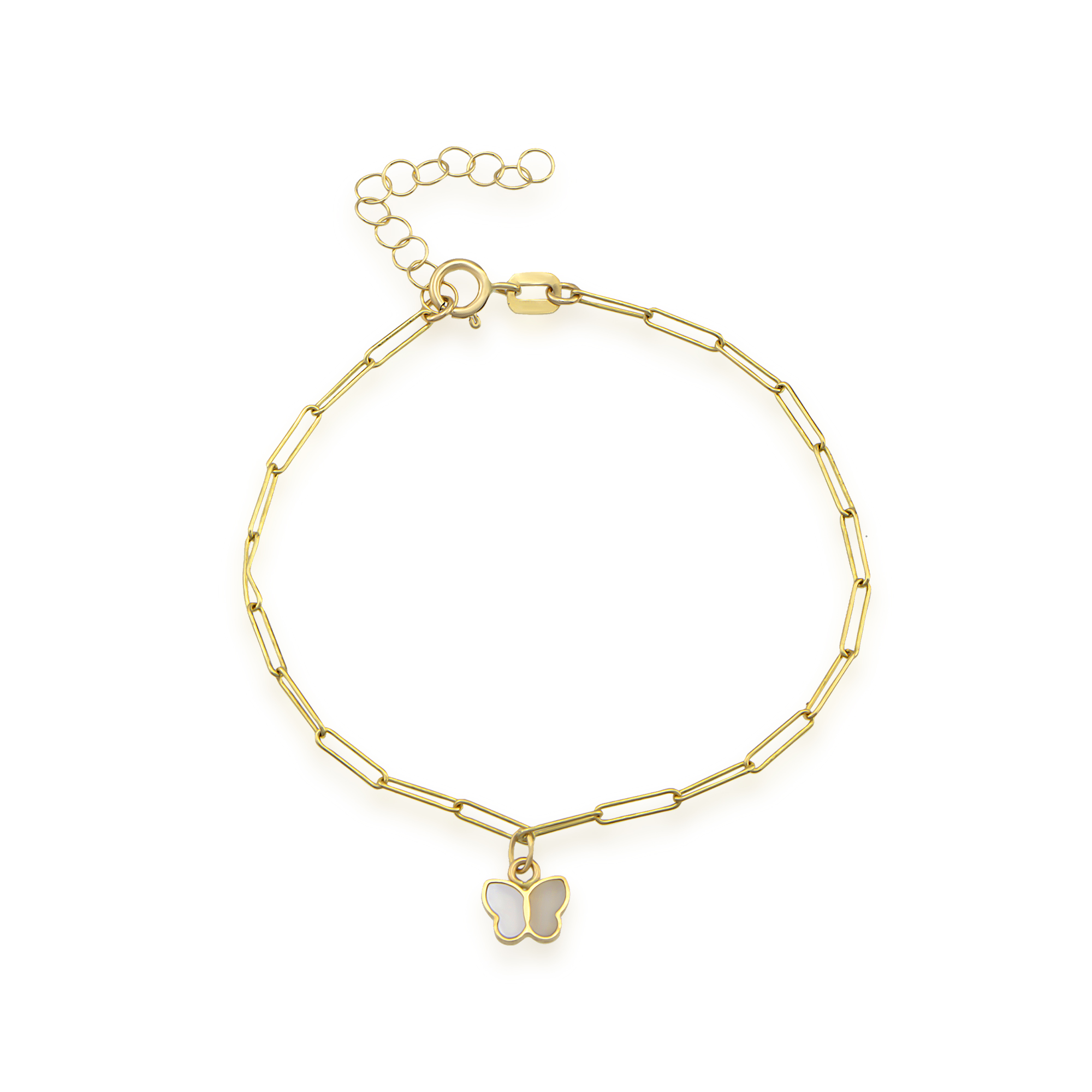 Diskretna narukvica od 14-karatnog žutog zlata i sedefa, sa priveskom u obliku leptirića.  Leptir je simbol sreće i radosti, poklonite je nekom ko Vas asocira na leptirića.