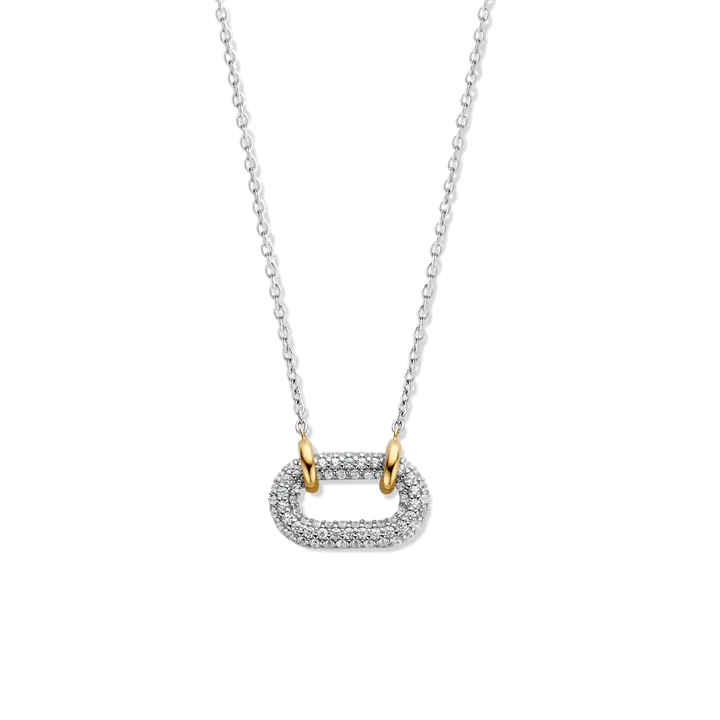 Ova TI SENTO srebrna ogrlica  ističe se povezanim prstenovima koji su ukrašeni cirkonima. Ogrlica je izrađena od 925  srebra i prekrivena debelim slojem platine kako bi bila zaštićena i zadržala svoj sjaj.