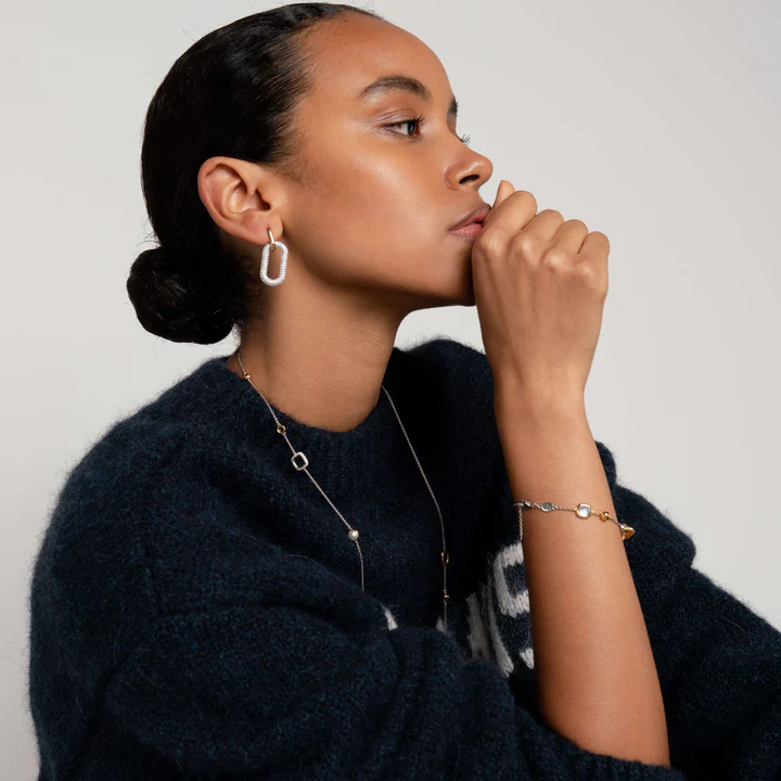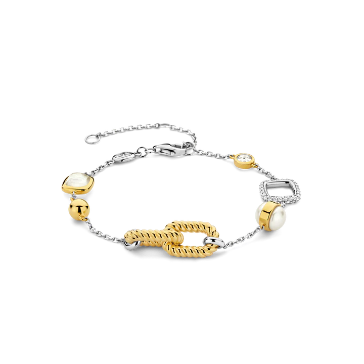 Ova TI SENTO pozlaćena narukvica  predstavlja harmoničnu kombinaciju luksuza i suptilne elegancije. Narukvica se ističe očaravajućim spojem svjetlucavih cirkona, toplih žutih zlatnih akcenata i zapanjujućih bisera . Dva karakteristična pozlaćena linka sa uvrnutim oblikom čine središnji element ovog dizajna. Izrađena od vrhunskog 925 srebra, narukvica je prekrivena slojem žutog zlata koji dodaje živahnosti i sjaj. Ova izuzetna narukvica je pravi simbol luksuza. Nosite je kao samostalan dodatak kako biste privukli pažnju ili je složite sa drugim komadima kako biste kreirali personalizovani izgled.
