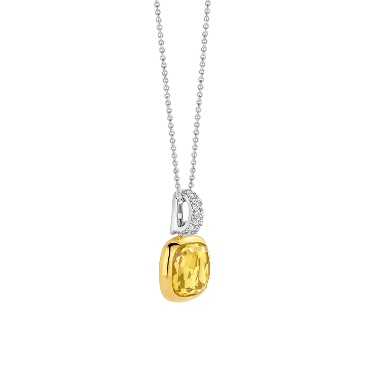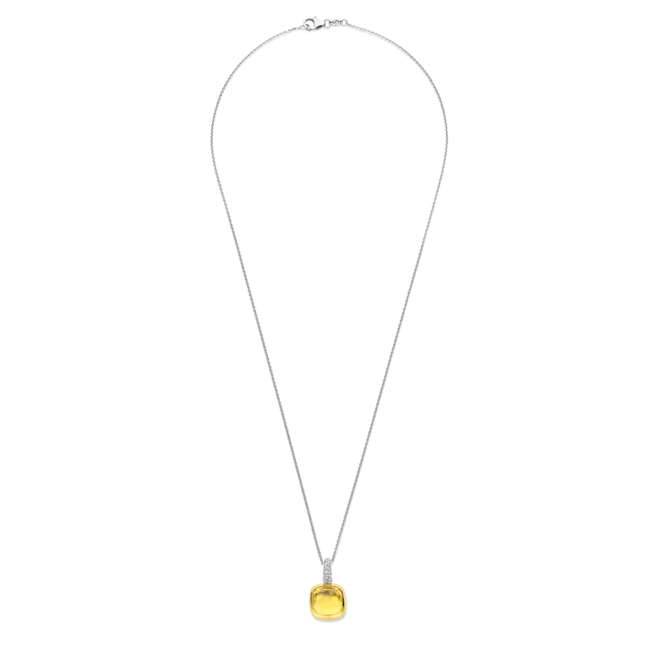 Izrađena od visokokvalitetnog srebra finoće 925, ogrlica ima privjezak koji sadrži prelijepi žuti kamen u obliku jastučeta, uokviren sjajnom zlatnom pozlatom. Njegova  površina predivno reflektuje svjetlost, prizivajući sunčani sjaj ljetnjih dana.