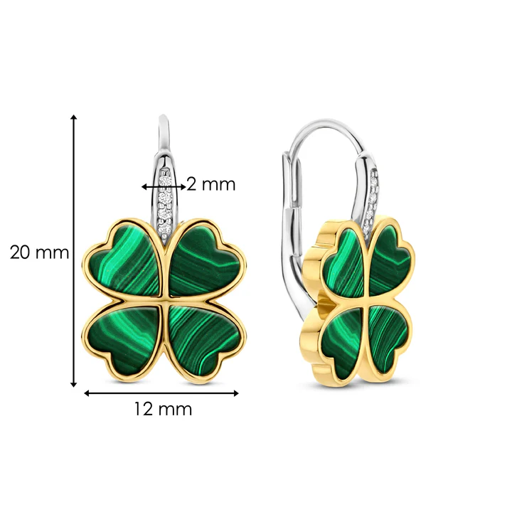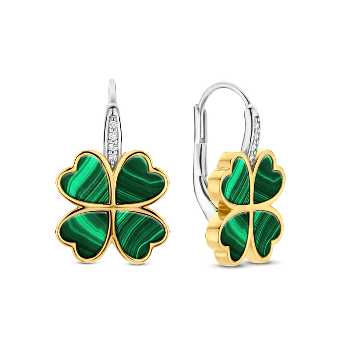 TI SENTO zlatno-srebrne viseće minđuše s djetelinom predstavljaju moderan talisman sreće i bezvremenskog stila. Izrađene od visokokvalitetnog srebra finoće 925, ove elegantne minđuše sadrže ram u obliku djeteline, prekriven žutim zlatom, koji obavija upečatljive kamenčiće u boji malahita. Sa svojim bogatim prirodnim izgledom, malahit simbolizuje harmoniju i vječnu ljepotu.