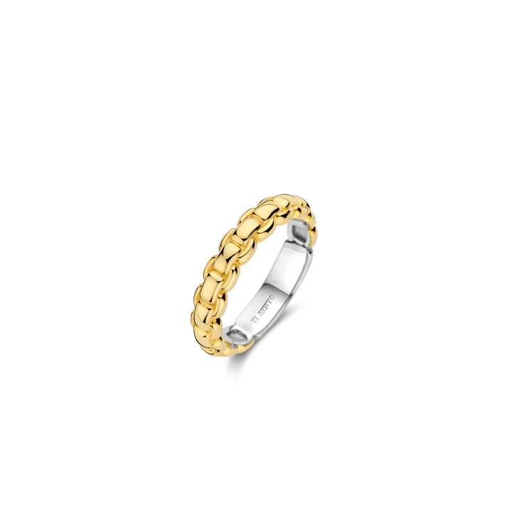 Ovaj TI SENTO prsten sa zlatnom pozlatom, ističe se nizom prepoznatljivih karika u obliku lanca. Ovaj komad savršeno spaja hrabar dizajn sa bezvremenskom elegancijom. Izrađen od visokokvalitetnog srebra finoće 925 i prekriven slojem sjajne žute pozlate, prsten donosi moderan akcenat zahvaljujući svom jedinstvenom dizajnu karika. Isprepletene karike stvaraju upečatljiv i svestran izgled, što ovaj prsten čini idealnim dodatkom za ležerne, ali i formalne prilike.