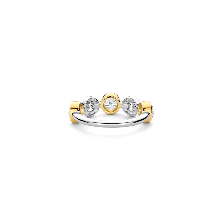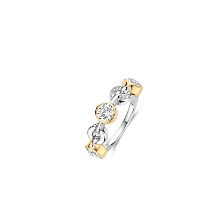 Dizajn prstena čine međusobno povezane okrugle karike, od kojih je svaka ukrašena blistavim bijelim cirkonima. Prsten sadrži i nježan krug koji dodaje dozu sjaja i raskoši. Ova igra glatkih linija i svjetlucavih detalja stvara razigran, a ipak sofisticiran izgled. Nosite ga samostalno za upečatljiv efekat ili ga kombinujte sa drugim TI SENTO komadima kako biste kreirali sopstveni stil. Pažljivo izrađen za osjetljivu kožu, ovaj prsten bez nikla i hipoalergenskih svojstava garantuje dugotrajan komfor i kvalitet.