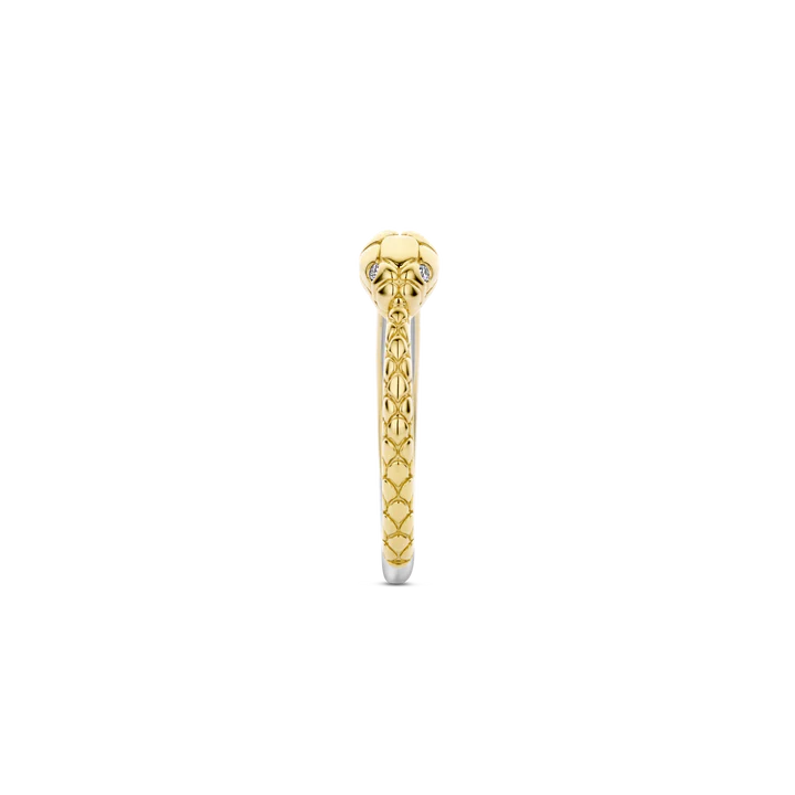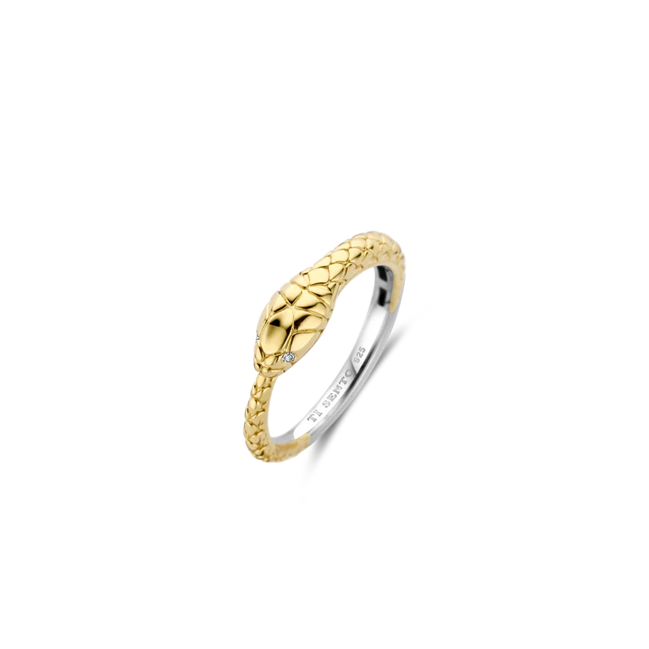 Prigrlite čaroliju zavodljivosti uz TI SENTO pozlaćeni prsten u obliku zmije 12354SY. Izrađen od srebra finoće 925 i presvučen sjajnim žutim zlatom, ovaj očaravajući komad donosi sofisticirani dizajn zmije. Oči zmije, ukrašene blistavim bijelim kamenčićima od cirkona, odišu hipnotišućim šarmom. Kao simbol ponovnog rađanja i obnove, zmija već vijekovima budi maštu.