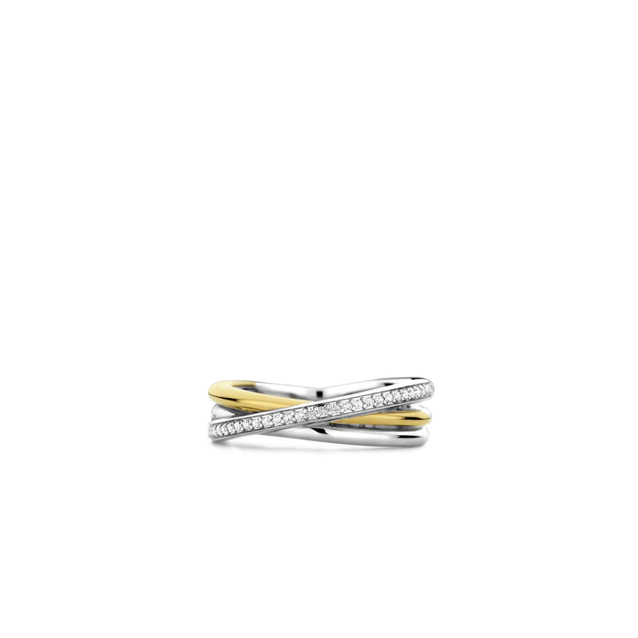 Otkrijte zavodljivi vintage šarm TI SENTO pozlaćenog srebrnog prstena 12346ZY. Ovaj prsten sadrži dvije isprepletene trake – jednu izrađenu od srebra finoće 925 i presvučenu platinom za hladan, savremen izgled, i drugu obloženu blistavim žutim zlatom za dašak topline i luksuza. Preko njih se elegantno pruža treća traka, ukrašena nizom blistavih bijelih cirkona.