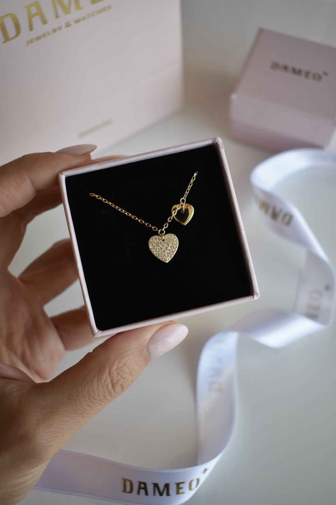 Ova ogrlica sa dva srca savršen je simbol ljubavi i povezanosti. Jedno srce je elegantno prekriveno blistavim cirkonima, dok drugo zrači jednostavnom ljepotom, stvarajući savršeni kontrast. Srce je univerzalni simbol ljubavi, pa je ova narukvica savršen  poklon za one koje volite.