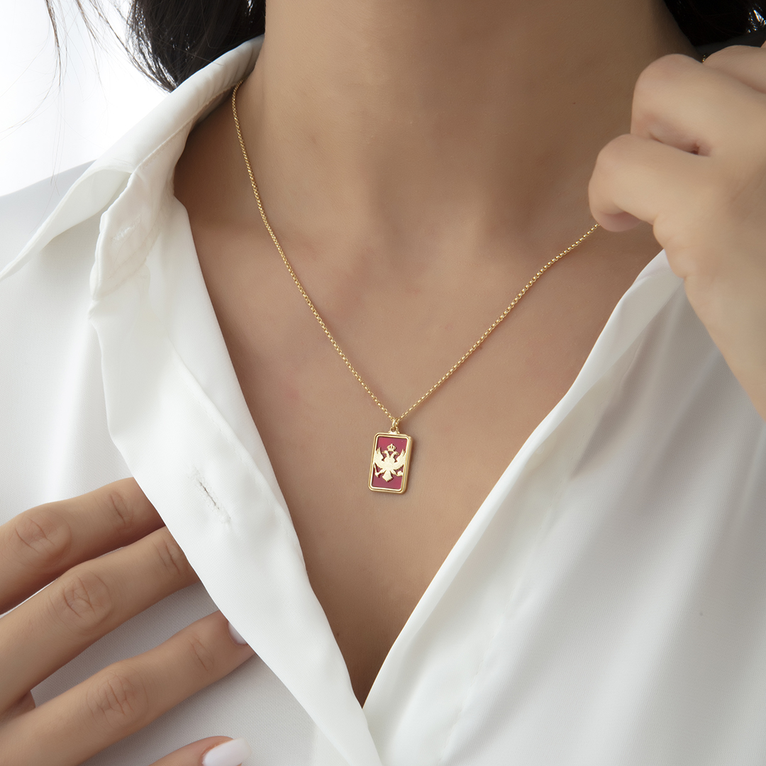 Elegantna srebrna ogrlica sa motivom grba Crne Gore. Pravougaonog oblika sa prepoznatljivim  motivom na crvenoj pozadini, ova ogrlica predstavljaju spoj tradicije i prefinjenog stila. Idealna su za svakodnevno nošenje ili kao simboličan poklon koji izražava ponos i pripadnost.