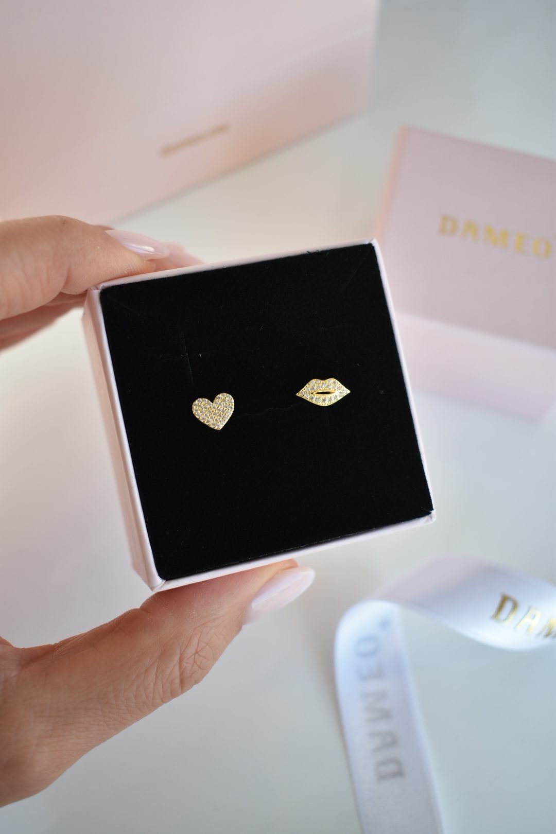 Ove nježne različite minđuše jedna u obliku srca, druga u obliku usana, sa blistavim cirkonima koji daju suptilan sjaj i luksuzan detalj. Savršene za izražavanje ljubavi, nježnosti ili kao romantičan poklon. Elegantne, lagane i idealne za svaki dan ili posebne prilike.