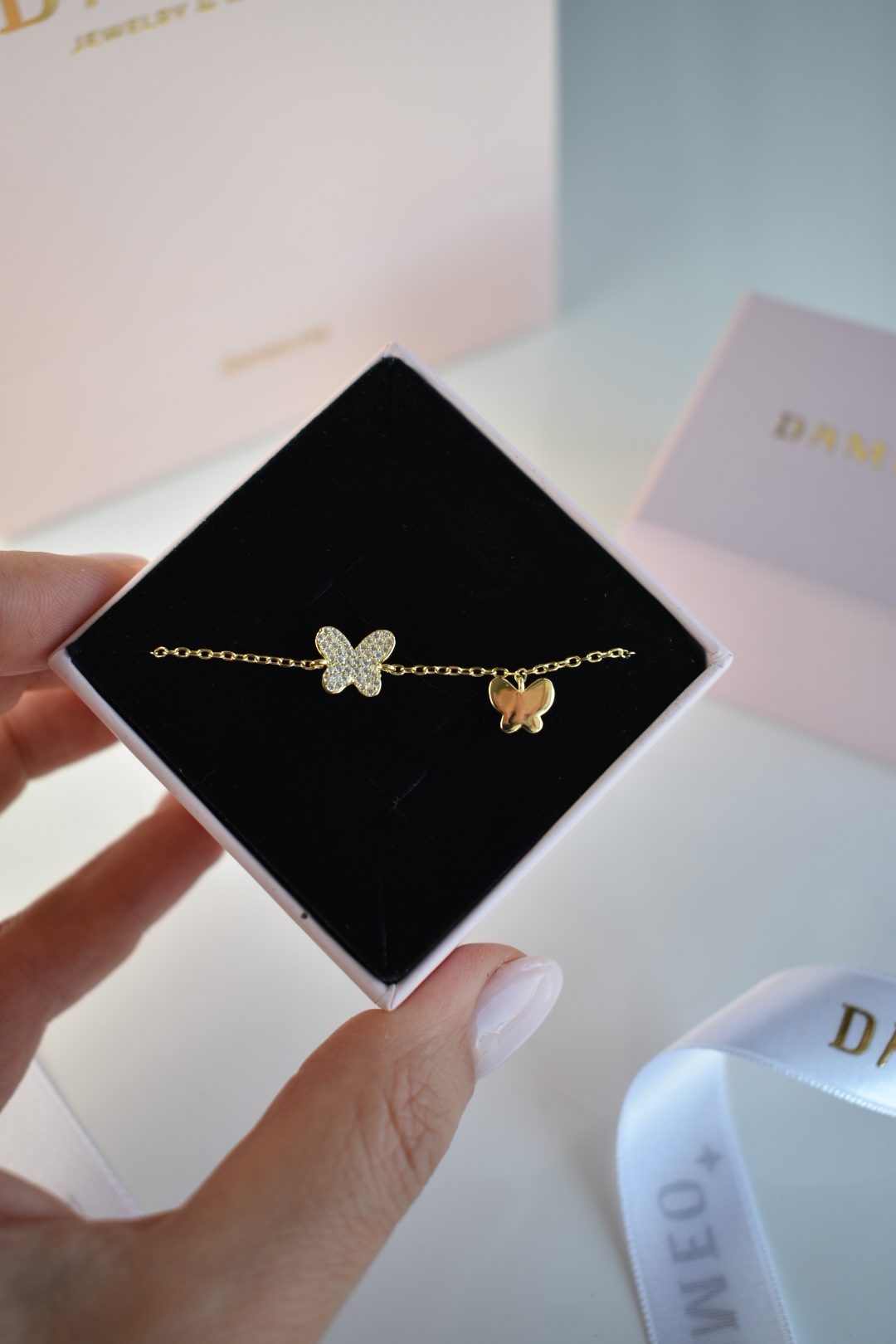 Predivna i nježna narukvica ukrašena s dva simbolična leptira – jednim potpuno prekrivenim cirkonima i drugim glatkim, minimalističkim. Savršena ravnoteža između elegancije i jednostavnosti, ova narukvica pedstavlja sklad između sjaja i suptilnosti.