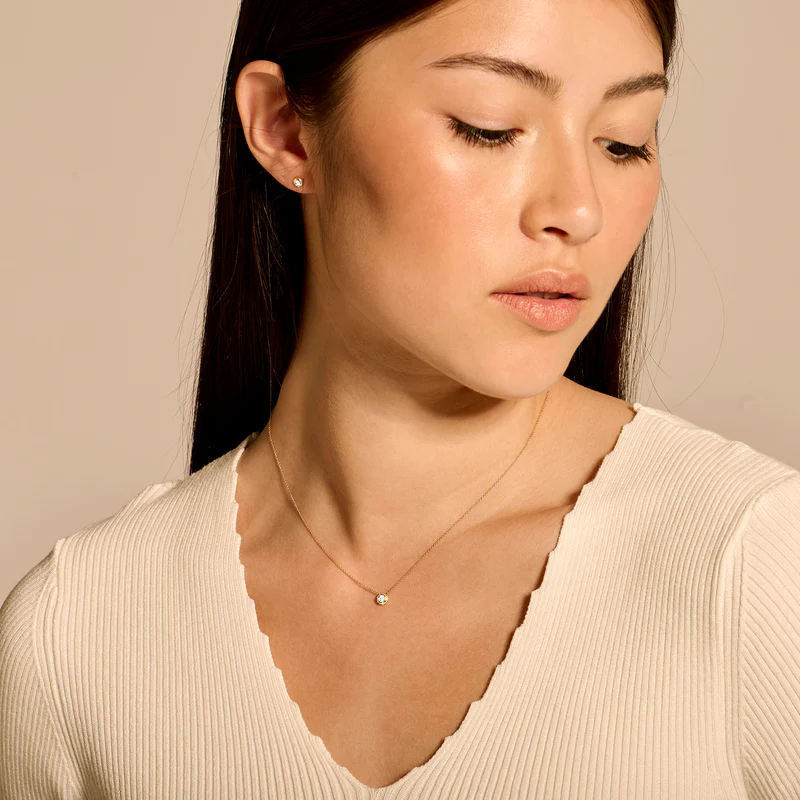Na ovom ogrlici od 14k žutog zlata svetluca briljantno sečeni dijamant u glatkoj postavci od belog zlata. Ogrlica ima dužinu od 42 cm, a dijamant težinu od 0,06 karata. Prelepo za nošenje samostalno ili u kombinaciji sa drugim nakitom iz naše kolekcije.