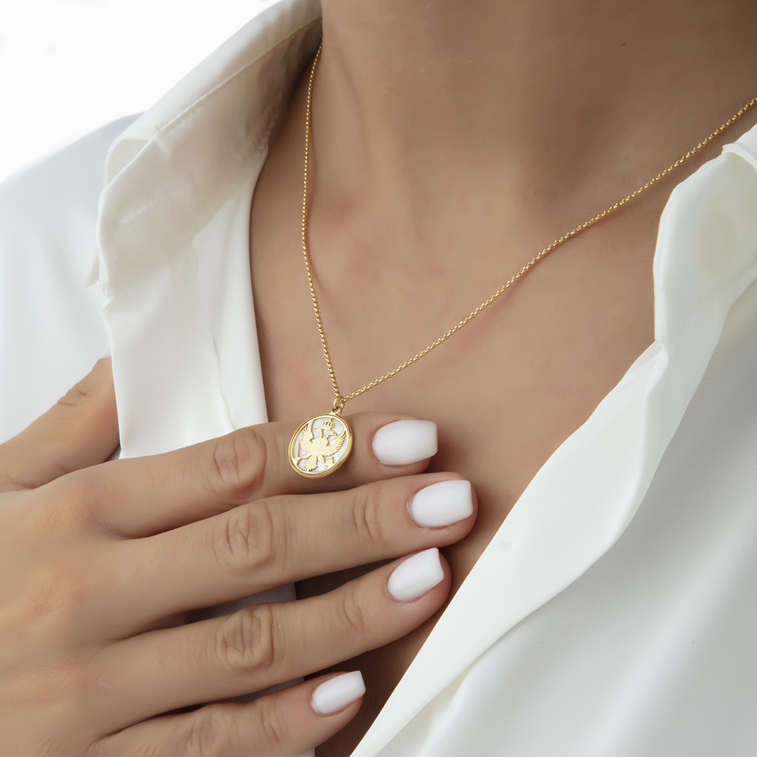 Elegantna srebrna ogrlica sa motivom grba Crne Gore. Okruglog oblika sa prepoznatljivim  motivom na bijeloj pozadini, ova ogrlica predstavljaju spoj tradicije i prefinjenog stila. Idealna su za svakodnevno nošenje ili kao simboličan poklon koji izražava ponos i pripadnost.