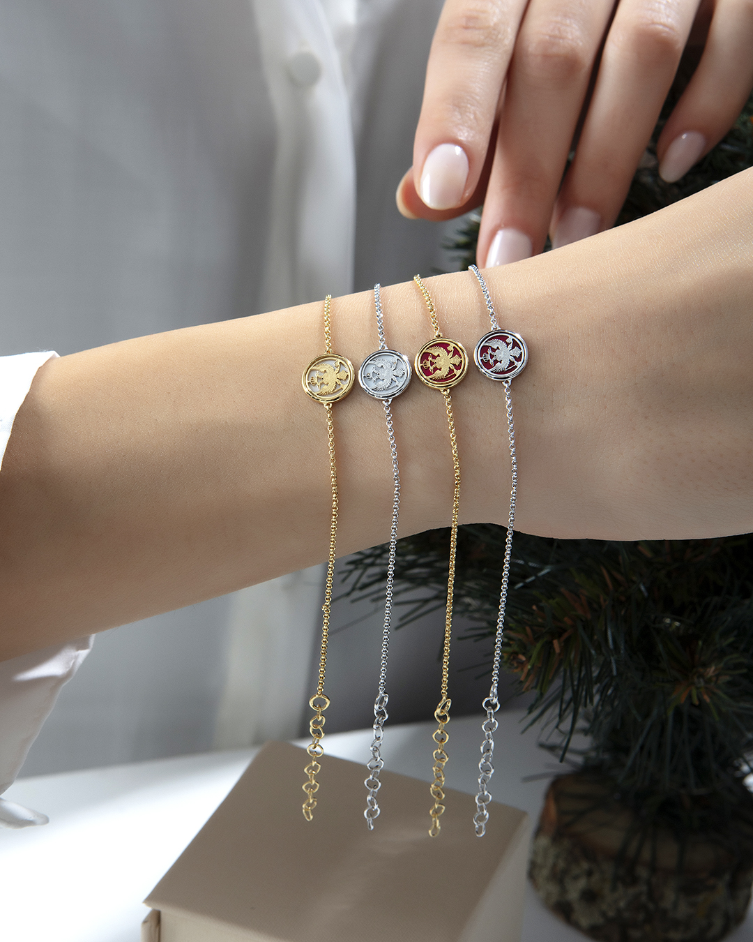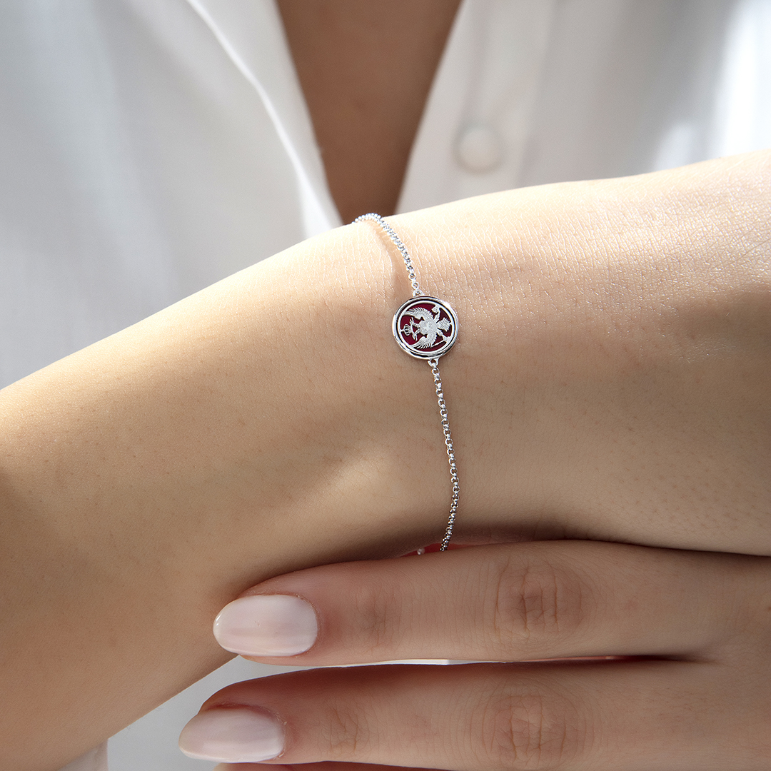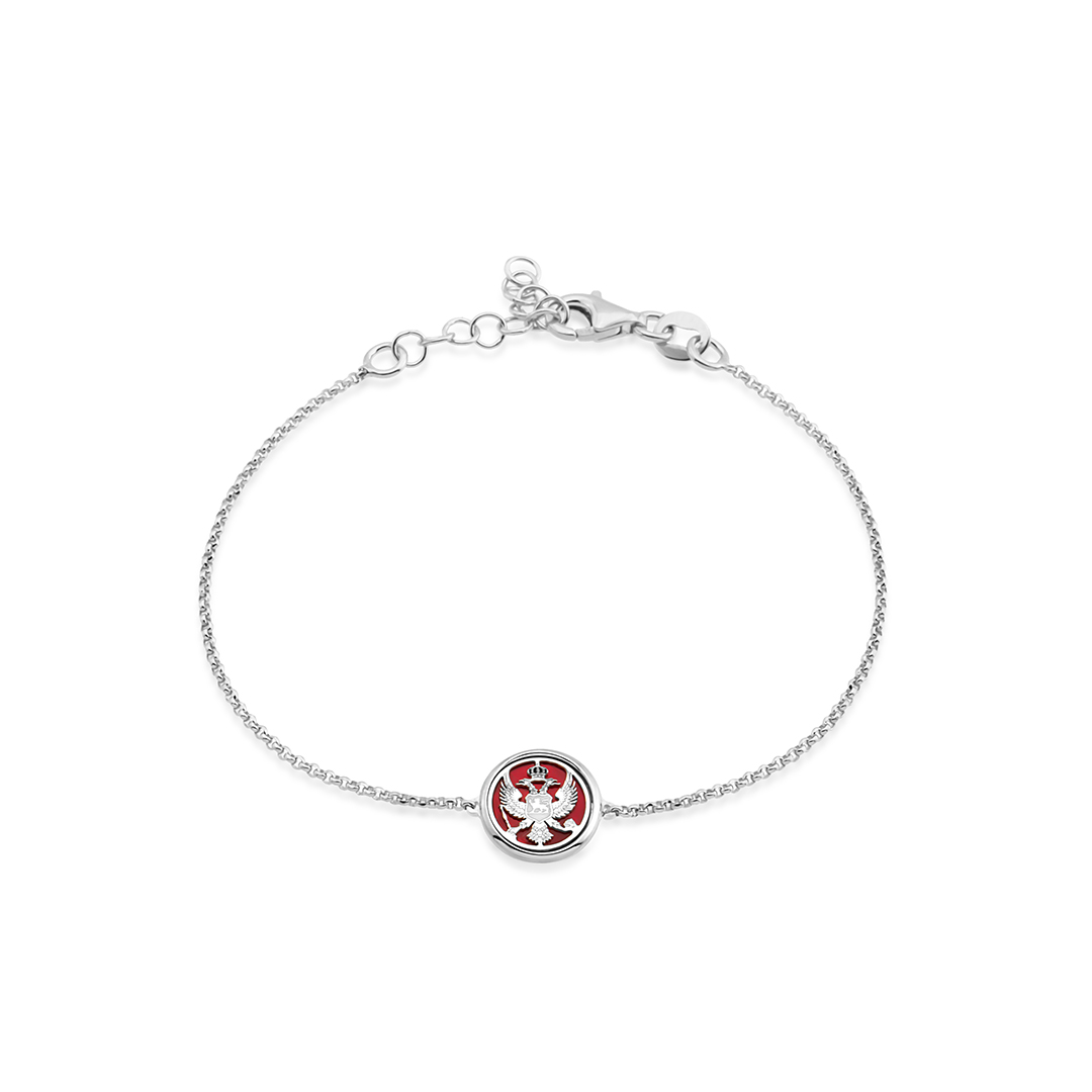 Elegantna srebrna narukvica sa motivom grba Crne Gore. Okruglog oblika sa prepoznatljivim motivom na crvenoj pozadini, ova narukvica predstavlja spoj tradicije i prefinjenog stila. Idealna je za svakodnevno nošenje ili kao simboličan poklon koji izražava ponos i pripadnost.