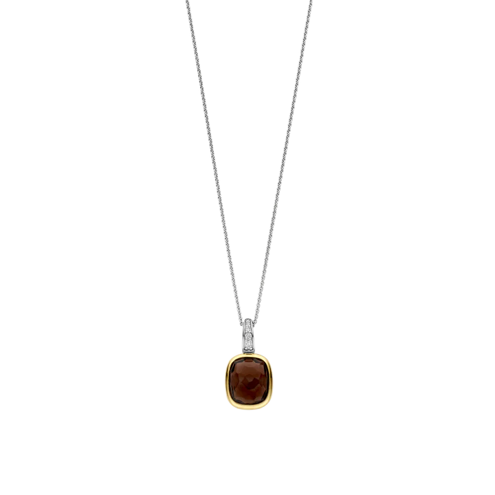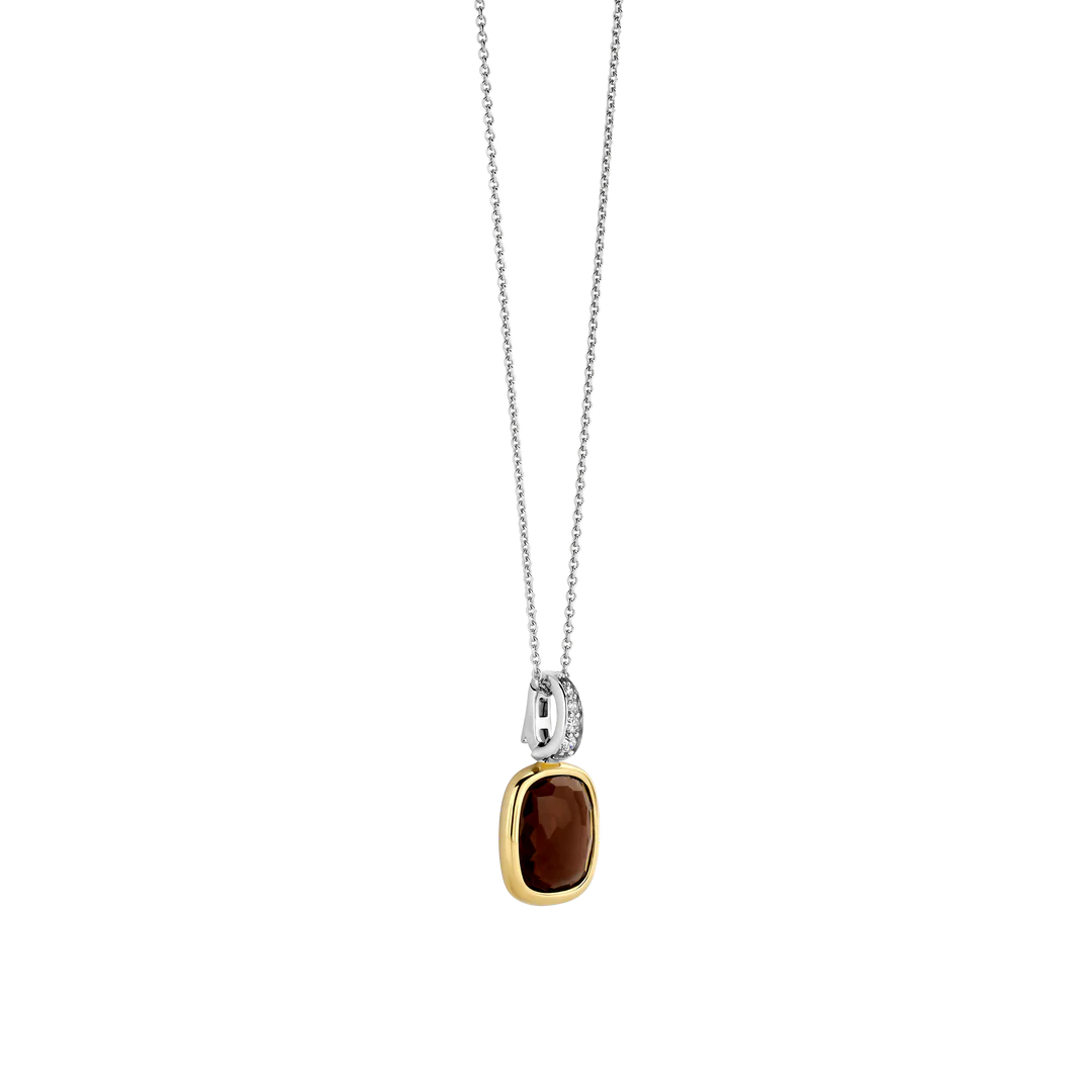 Dodajte toplu dubinu svom izgledu uz ovaj TI SENTO pozlaćeni srebrni privezak. Izrađen od 925 srebra, izduženi jastučasti oblik nosi prozirni kamen dimno-smeđe nijanse, bogatog tona i nježno fasetiran kako bi reflektovao svjetlost. Pozlaćeni okvir u žutoj nijansi suptilno uokviruje kamen toplinom, dok platinom presvučena kopča – ukrašena detaljima od briljantno brušenog bijelog kubnog cirkona – dodaje sjaj iznad.