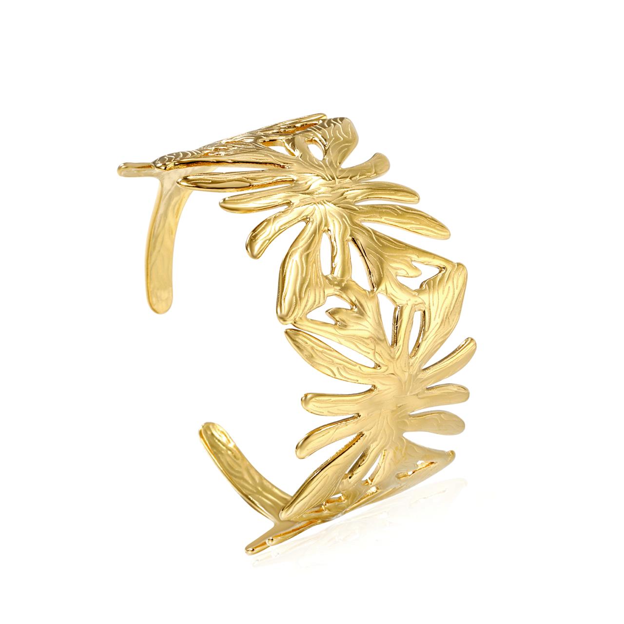 Narukvica od nerđajućeg čelika sa 18k pozlatom iz Alkima kolekcije, predstavlja pravo umjetničko djelo na vašem zglobu, slaveći ljepotu prirode kroz detaljno izrađene motive palminog lišća. Komadi su otporni, dugotrajni i zadržavaju svoj sjaj, što ih čini savršenim izborom za svakodnevno nošenje.