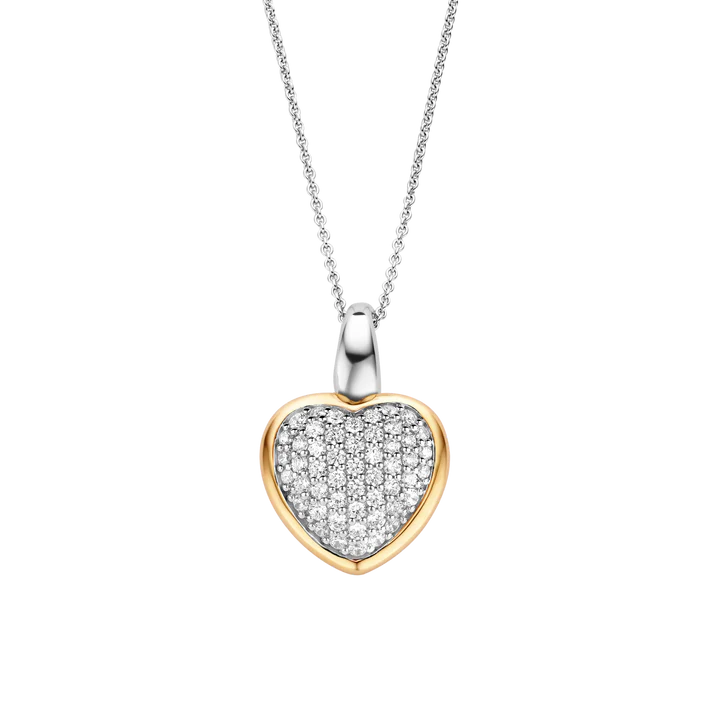 Ovaj TI SENTO privjesak od srebra obloženog zlatom 6801ZY ima simpatičan oblik srca, ručno postavljen od svjetlucavih bijelih kubičnih cirkona. Njegovo zapanjujuće svjetlo će osvježiti vaš outfit. Kombinujte ovaj komad sa drugim simbolima ljubavi, mira i sreće. Ovaj privjesak, napravljen od 925 srebra