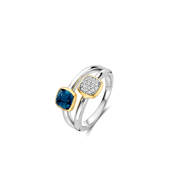 Ovaj jedinstveni dizajn sastoji se od dva prstena koji se elegantno spajaju, ostavljajući prostor između njih. Svaki prsten krasi kamen u obliku jastuka: jedan ukrašen očaravajućim tamnoplavim kamenom, dok drugi blistavim nizom sjajnih bijelih cirkona. Oba kamena su postavljena u sjajne postavke pozlaćene žutim zlatom, čime se dodatno naglašava njihova prirodna ljepota.