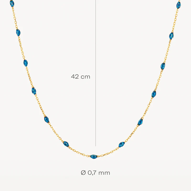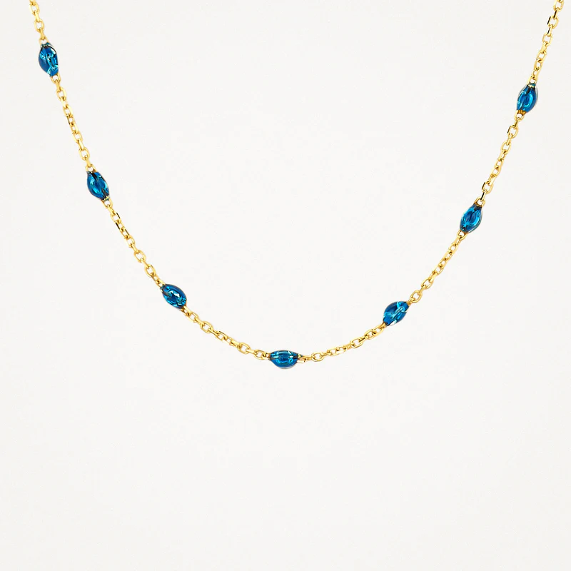 Providni plavi resin kamenovi daju ovom ogrlici od 14k žutog zlata s opružnim zatvaračem upečatljiv izgled. Izvrsna je i kao samostalni komad ili u kombinaciji s drugim resin nakitom iz naše kolekcije, na primjer s narukvicom 2226YRB.