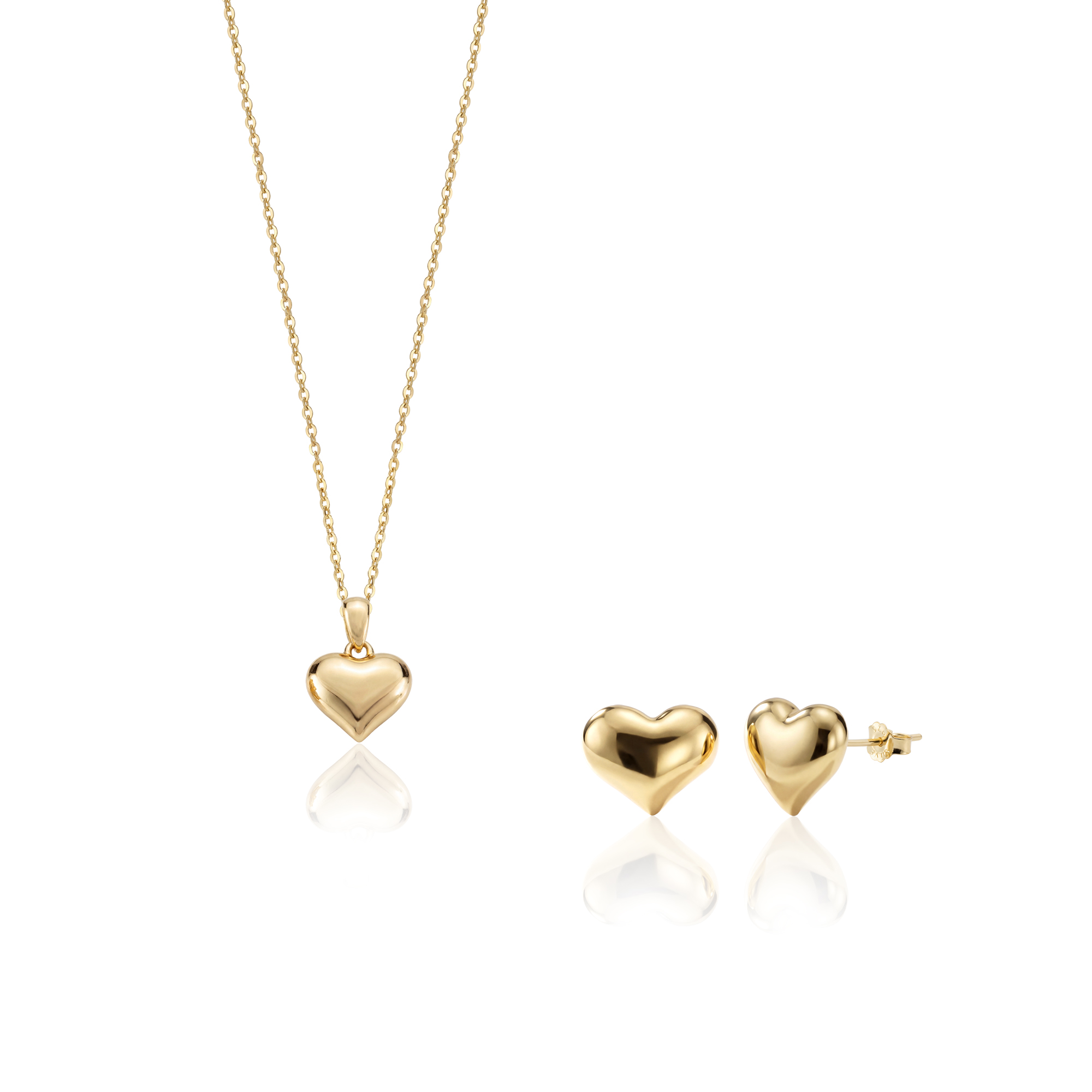 Privezak i minđuše su u obliku punog, trodimenzionalnog srca sa glatkom, ogledalskom završnom obradom. Oblik srca je zaobljen i mekan, što omogućava predivno prelamanje svjetlosti pri svakom pokretu.